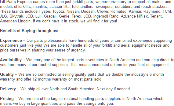 All our forklift parts are offered at the best prices. Call today to get a price quote on one of the parts or attachments we offer. We can be reached at: